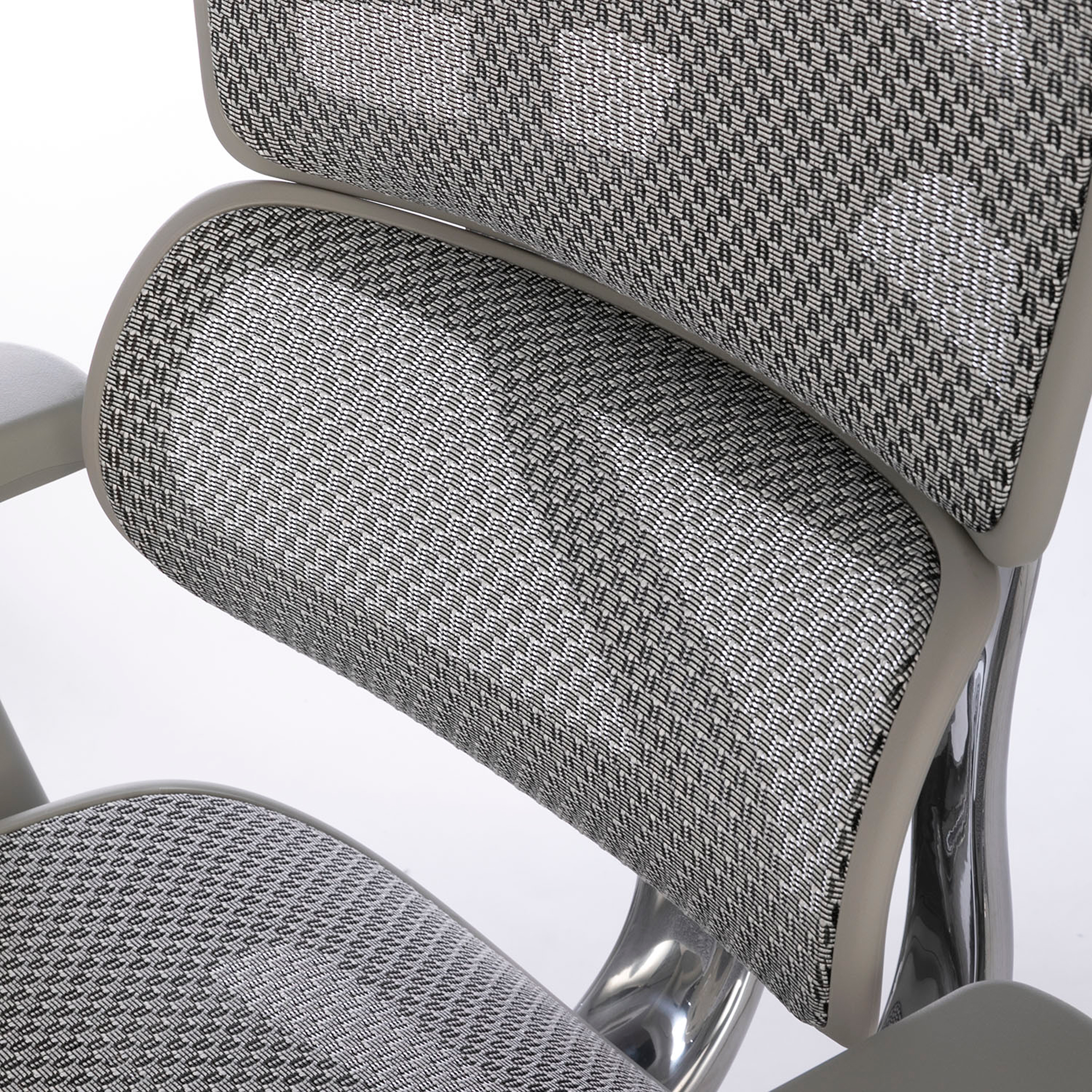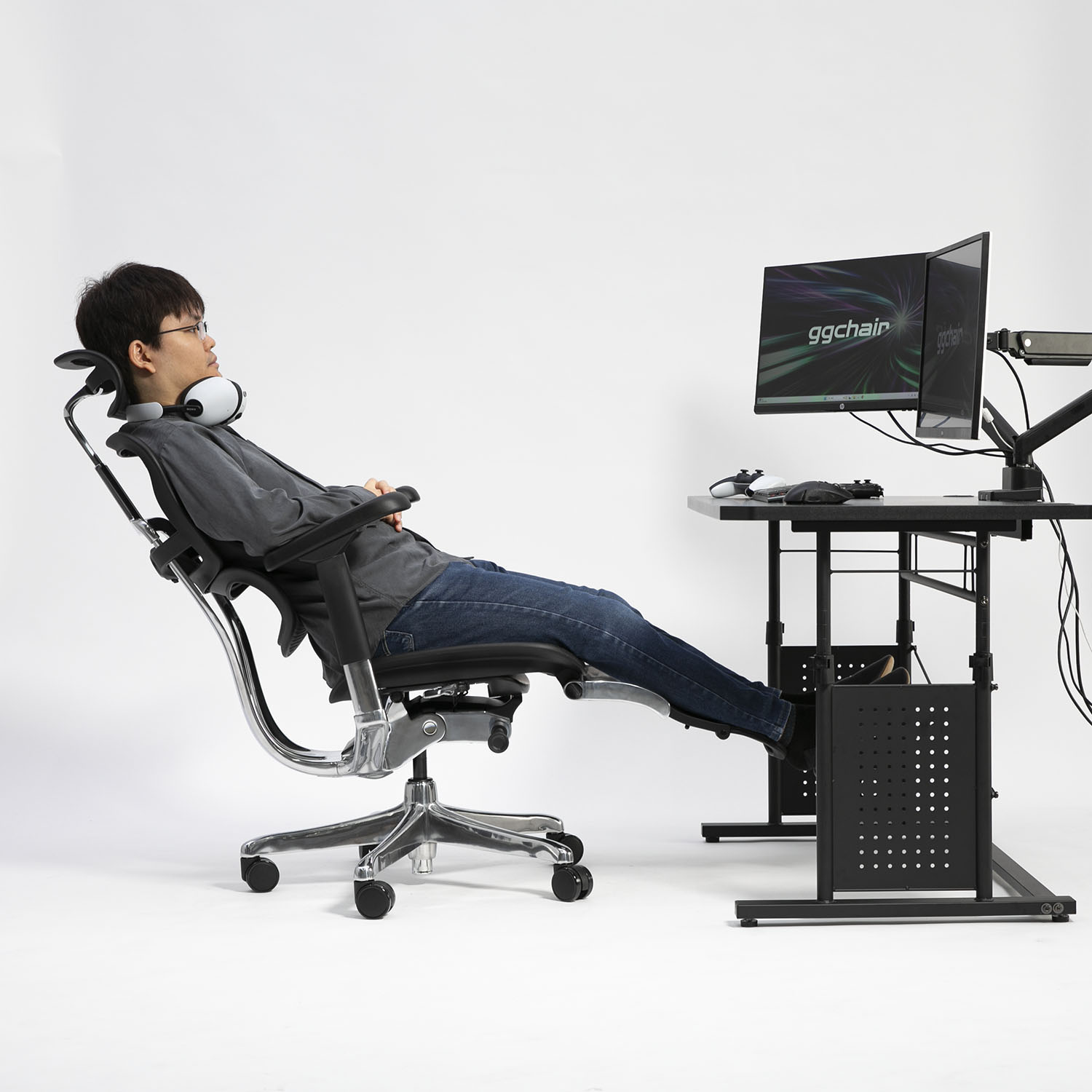 ロッキング(リクライニング)時も頭の位置を自在に調整でき、疲労リセットの質を高める、集中と追従を極めた一脚です。