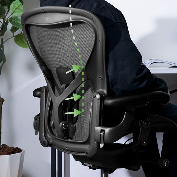 姿勢を適切にするアーロンチェア独自のポスチャーフィットSLは、腰椎と仙骨の2ヵ所を支える設計。