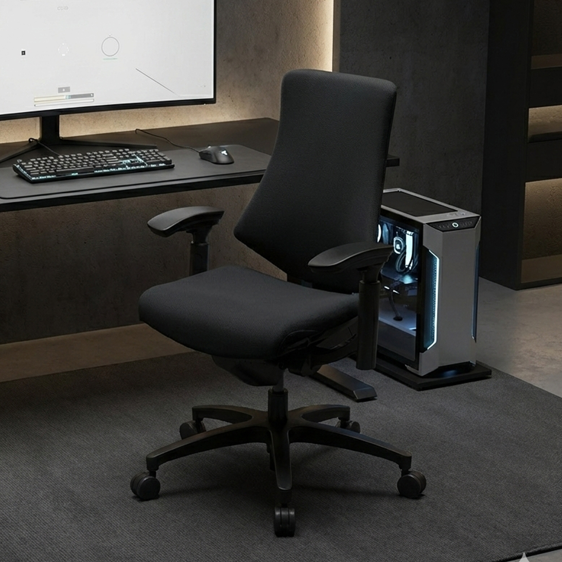 腰をしっかりサポートしながら、上にいくにしたがって肩周りがフリーになるようにデザインされたチェア。背をきちんと支えながらも肩を動かしやすいため、姿勢が変わりやすいゲームプレイ時にも快適です。極力無駄を省いたフォルムは、コンパクトなゲーミング環境にも最適。軽快さとシャープさを合わせ持つ機能美が、よりゲームプレイ時の気持ちを高めてくれます。