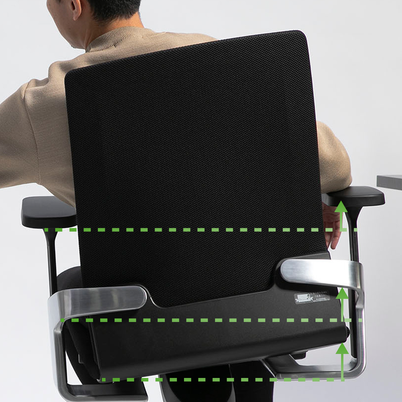 座面と背もたれが独立して動くため、身体の前後左右の動きに自然に追従。まるで人間の関節のように柔軟に動きます。