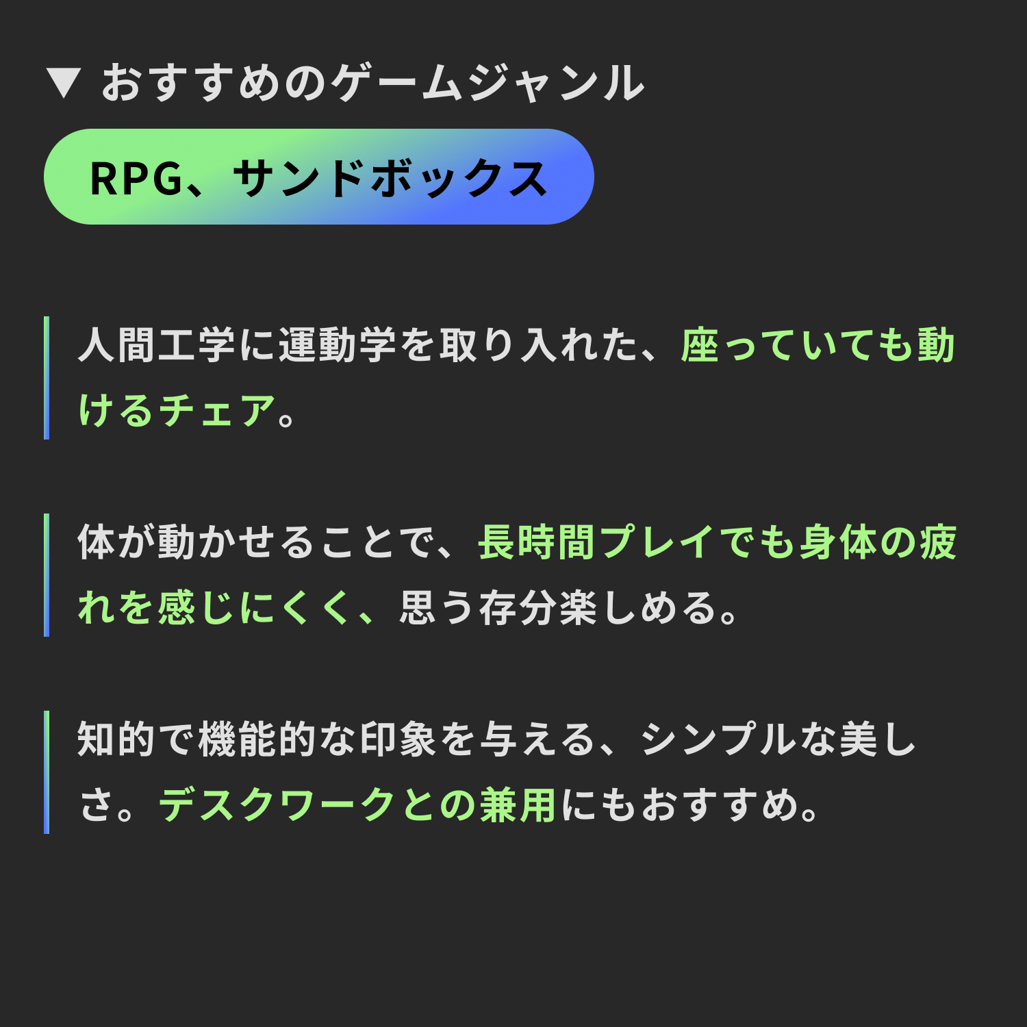 「健康的な着座」で、身体の凝りを気にせず長時間プレイを楽しめます。