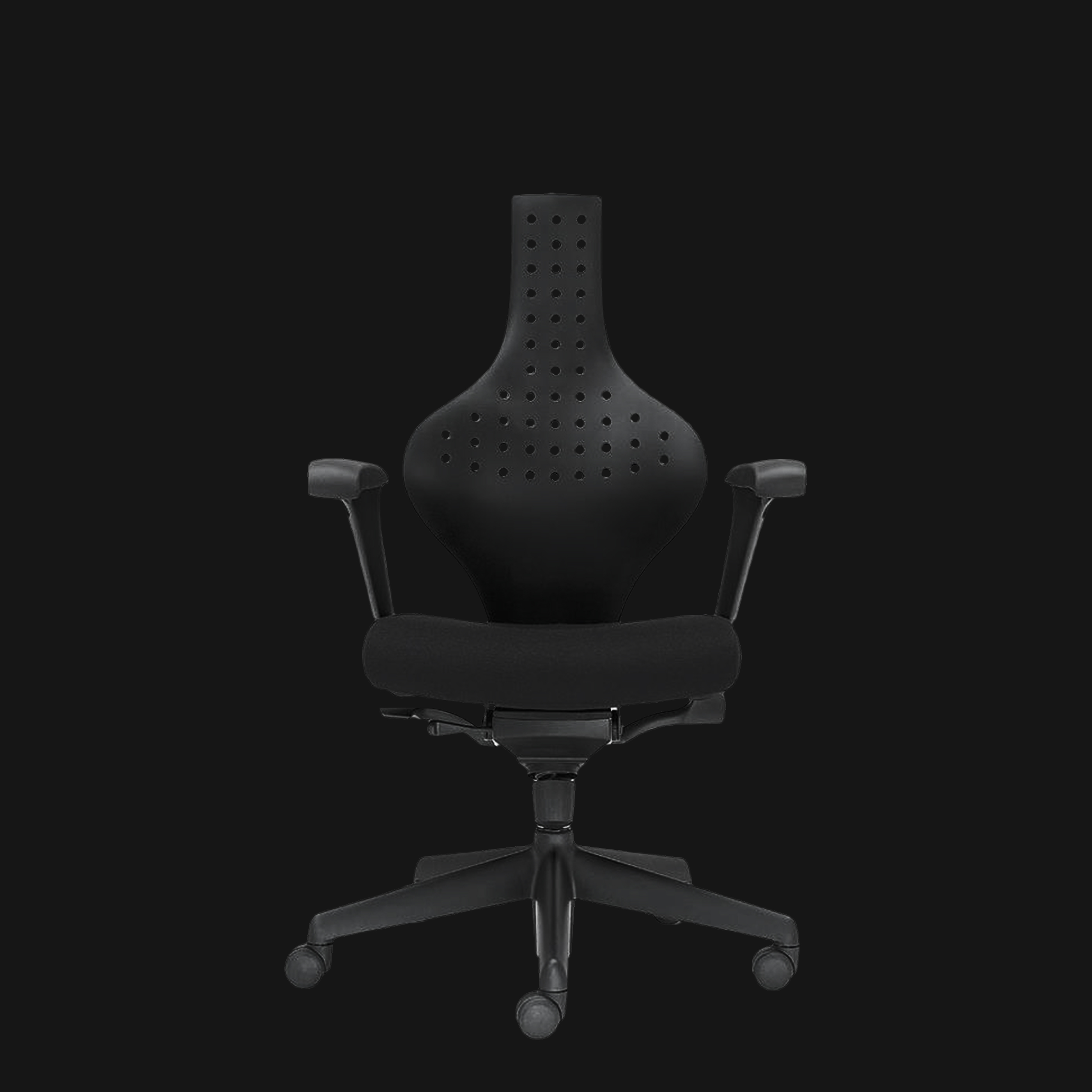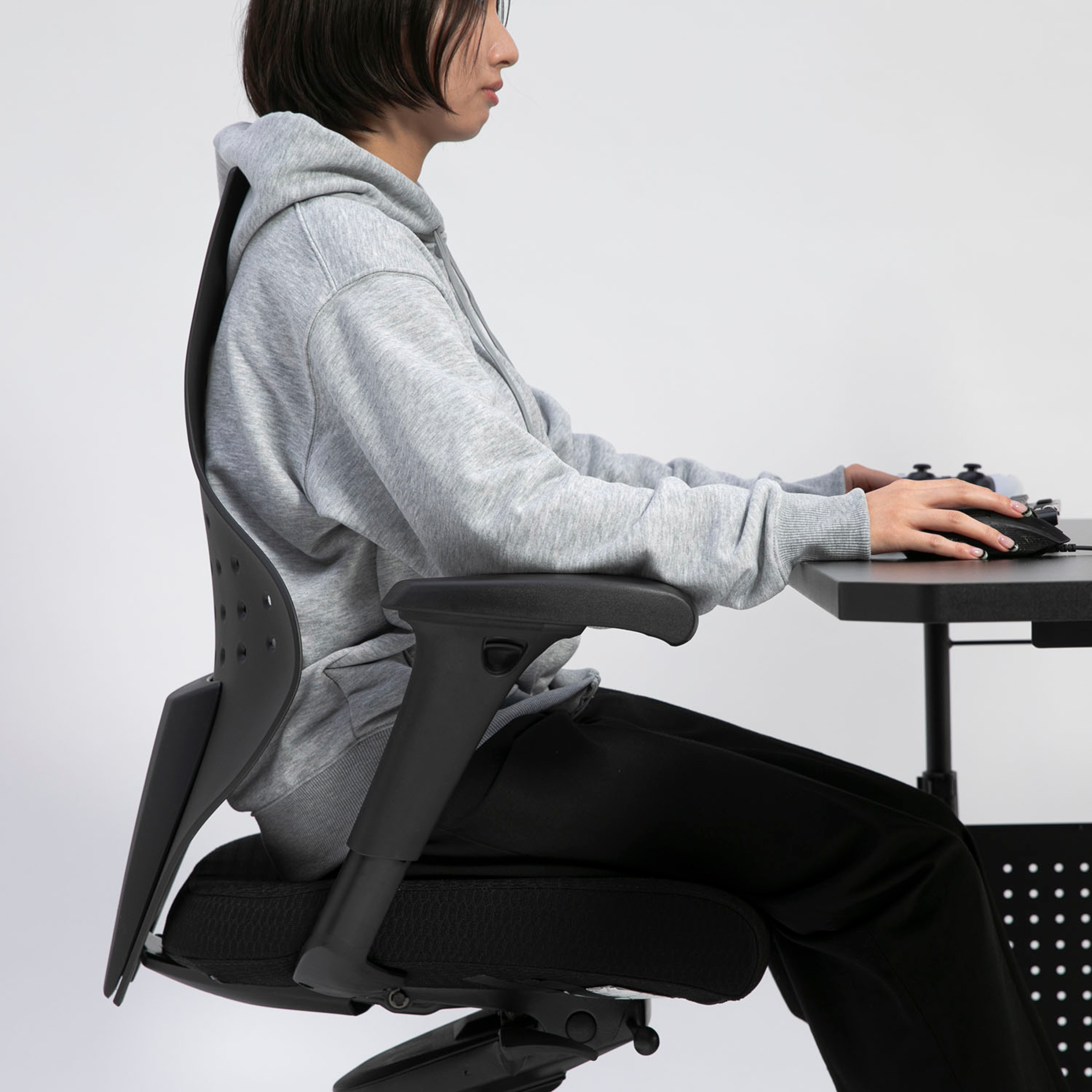 背もたれは背骨のS字カーブに沿って曲線を描き、上部が前方に突き出した絶妙な形状。この突き出た上部が肩甲骨の位置を正し、背中が丸くなるのを阻止。前のめりでも猫背になりにくく、負担の少ない姿勢が自然に取れます。
