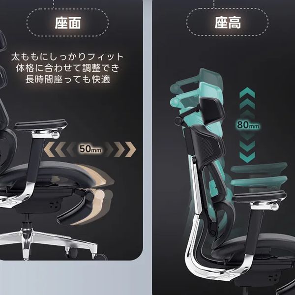 面と腰部が連動。背骨の自然な動きに合わせて連動する構造で、腰回りをしっかり支えます。前傾姿勢でも後傾姿勢でも、常に腰のカーブにフィットするため、長時間座っても疲れにくい設計になっています。